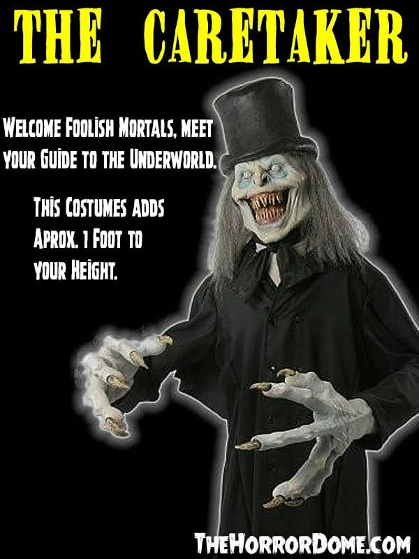 When morbid curiosity gets the best of you, you venture into a nightmarish realm. Let The Caretaker be your guide as you discover a demonic underworld of damned souls and eternal suffering. The perfect character for ushering your guests through a haunted house, this wise old chap has seen more than his fair share of supernatural events, darkness and depravity. Designed to add one foot to your height, almost anyone will seem imposing in this premium Halloween costume. The Night Terror Caretaker costume comes complete with an over the head mask, hand/arm extenders, and a long black, robe-like garment. Brilliantly crafted by inspired artists and designers at The Horror Dome, this classic ghoul has a permanent, devilish grin that exposes rows or sharp, pointy teeth, and dead-looking eyes that show no hint of empathy or compassion. Only the most intrepid trick or treaters will approach your home with The Caretaker standing watching over your front porch.