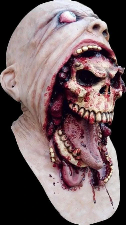 Create a strikingly unique character with the Worst Nightmare Halloween mask from The Horror Dome. Hand detailed by twisted, yet talented artists, this one of a kind design is sure to turn heads at the next costume party. An over the head, latex design, this pro-quality mask delivers a seamless look when worn with a shirt or jacket. The Worst Nightmare mask features a maniacal, murderous skull breaking out of a poor slob’s mouth. Terrified, bulging eyes point upwards and broken teeth surround the emerging demon.